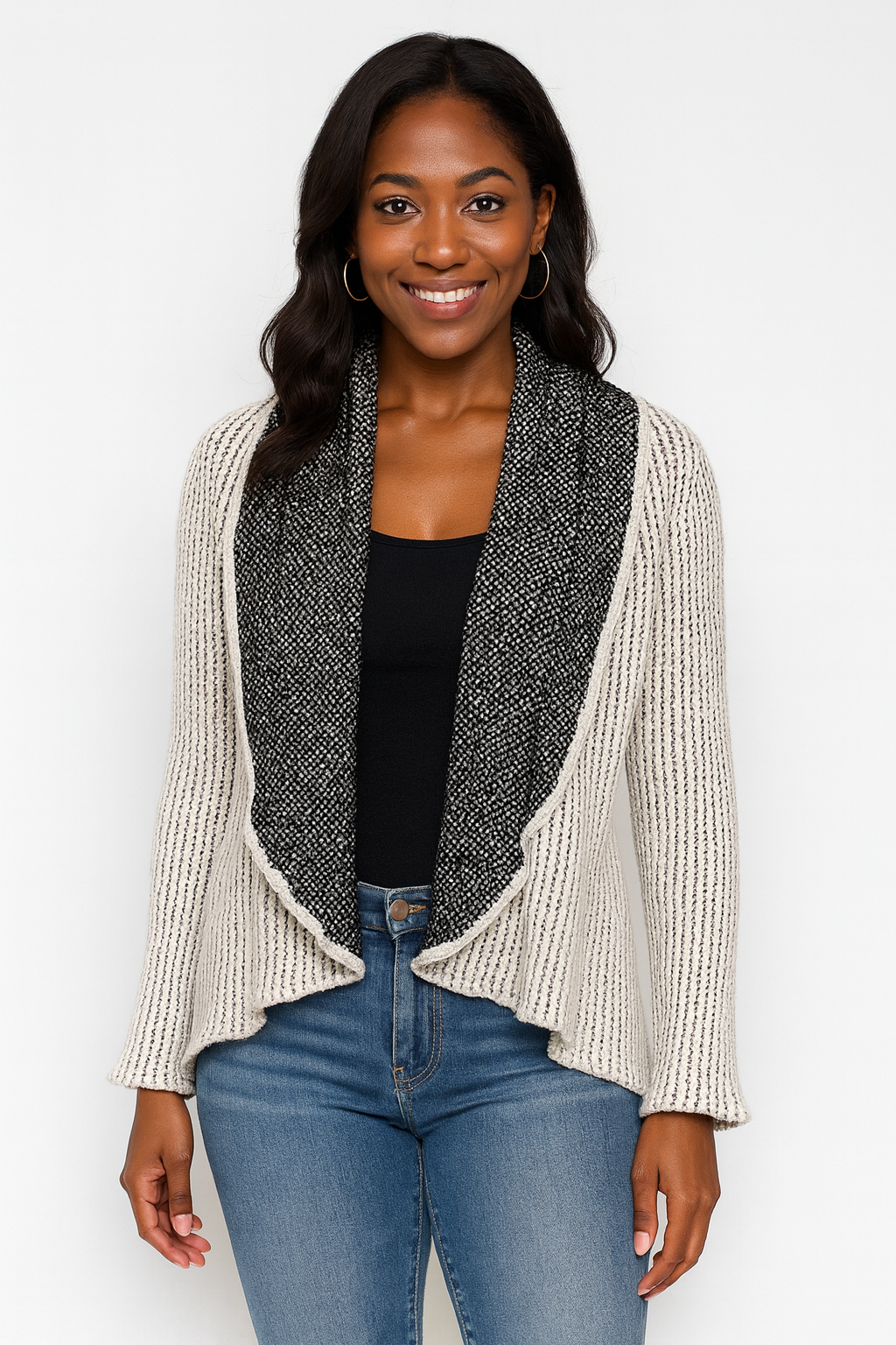 The Lux Loom Hip Cardigan embraces elegant contrast with reversible versatility. One side features a luxurious cotton light print for refined, understated elegance, while the reverse showcases a sophisticated webbed cool tercel design for modern edge. Transition seamlessly between refined and contemporary aesthetics with a single piece that adapts to your mood and occasion.